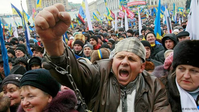 13. Entretanto, o presidente da Ucrânia, Yanukovych, constitucionalmente eleito, não concordou em aderir à UE sem discutir as draconianas condições impostas: adotar as medidas econômicas do figurino do FMI: cortar em metade o valor das pensões, suprimir benefícios sociais, demitir funcionários, privatizar mais patrimônio público em favor de plutocratas, tudo para pagar dívidas com bancos ocidentais.